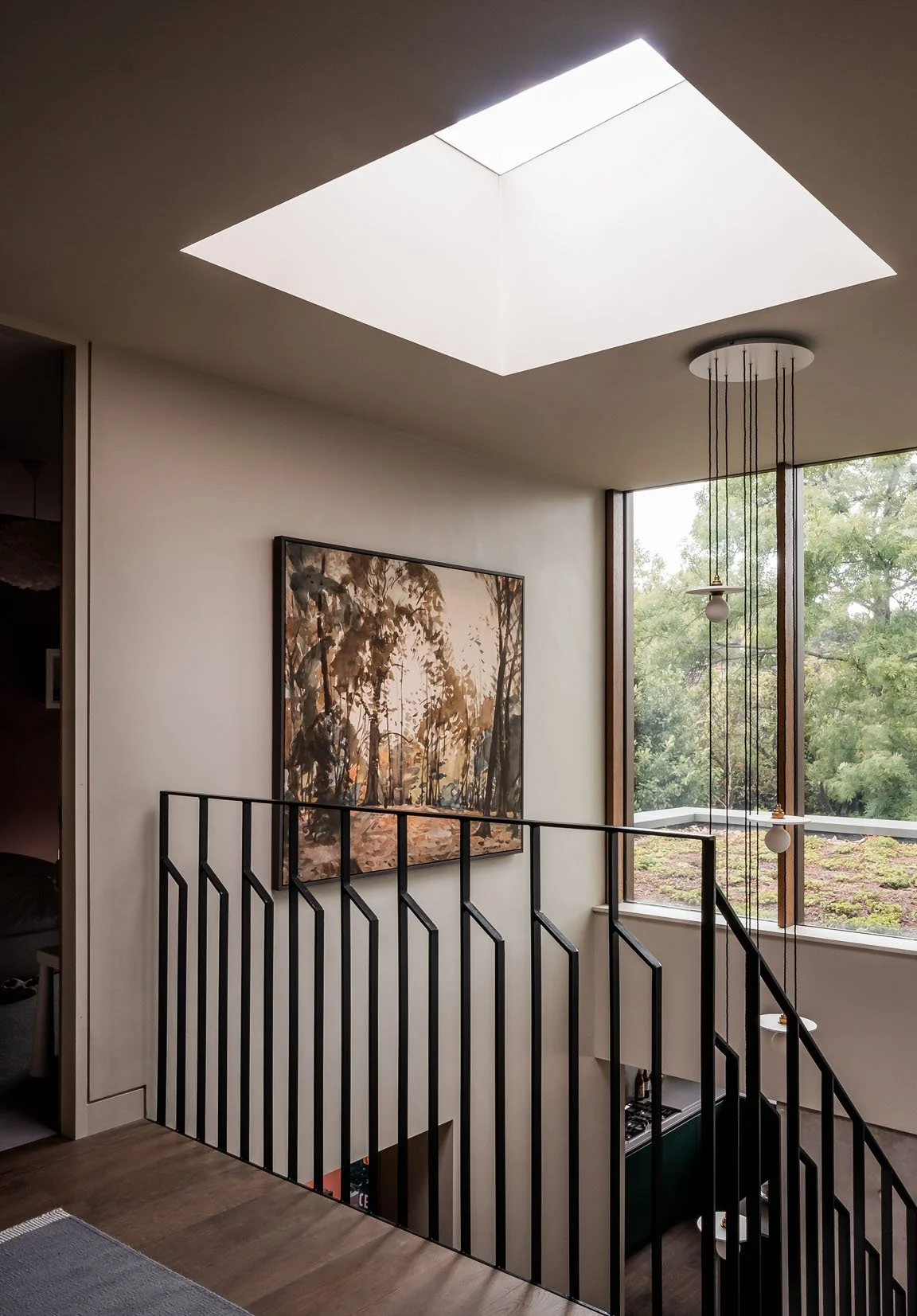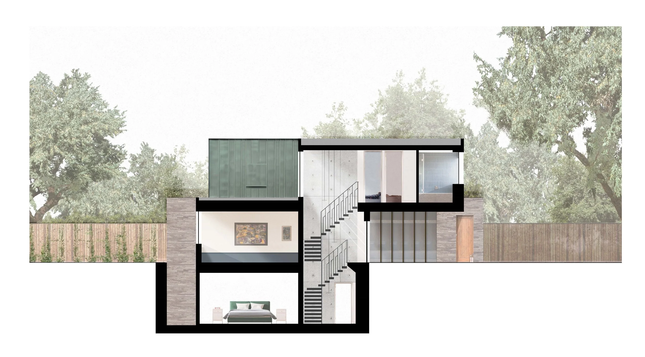 Cantilever house is a newbuild, five bedroom single family home built on a vacant back-land plot in Dulwich, South London. Staggered massing over three floors and an extensive pure cantilever were designed to get the most accommodation on the site without compromising neighbour privacy, the existing mature trees and maximising the garden space. The house is made from concrete linear bricks, green zinc cladding with bronze accents framing large glazed openings. Internally a visual concrete atrium links the three floors with a spiralling cantilevered steel staircase rotating up through the void.